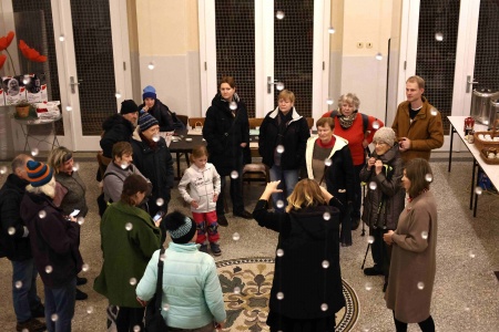 Zaplněná vstupní hala si vyslechla uvítání starostky jabloneckého Sokola Jitky Skalické a architektky Idy Čapounové, která hosty seznámila s historií místa i myšlenkou samotného obrazu. Všichni, kdo k nám na vernisáž zavítali využili možnosti prohlídky další dokončené části instalace “Studna”, která celý příběh znázorněný na Moemině obrazu uvozuje. Slavnostní atmosféru dotvářel hudební doprovod příležitostného duetu baryton saxofonu s violou v podání Pavlíny Müllerové a Dity Procházkové. Hudba se nesla prostorem sokolovny, za okny se snášel sníh a v dlaních hřál čaj a svařené víno.
